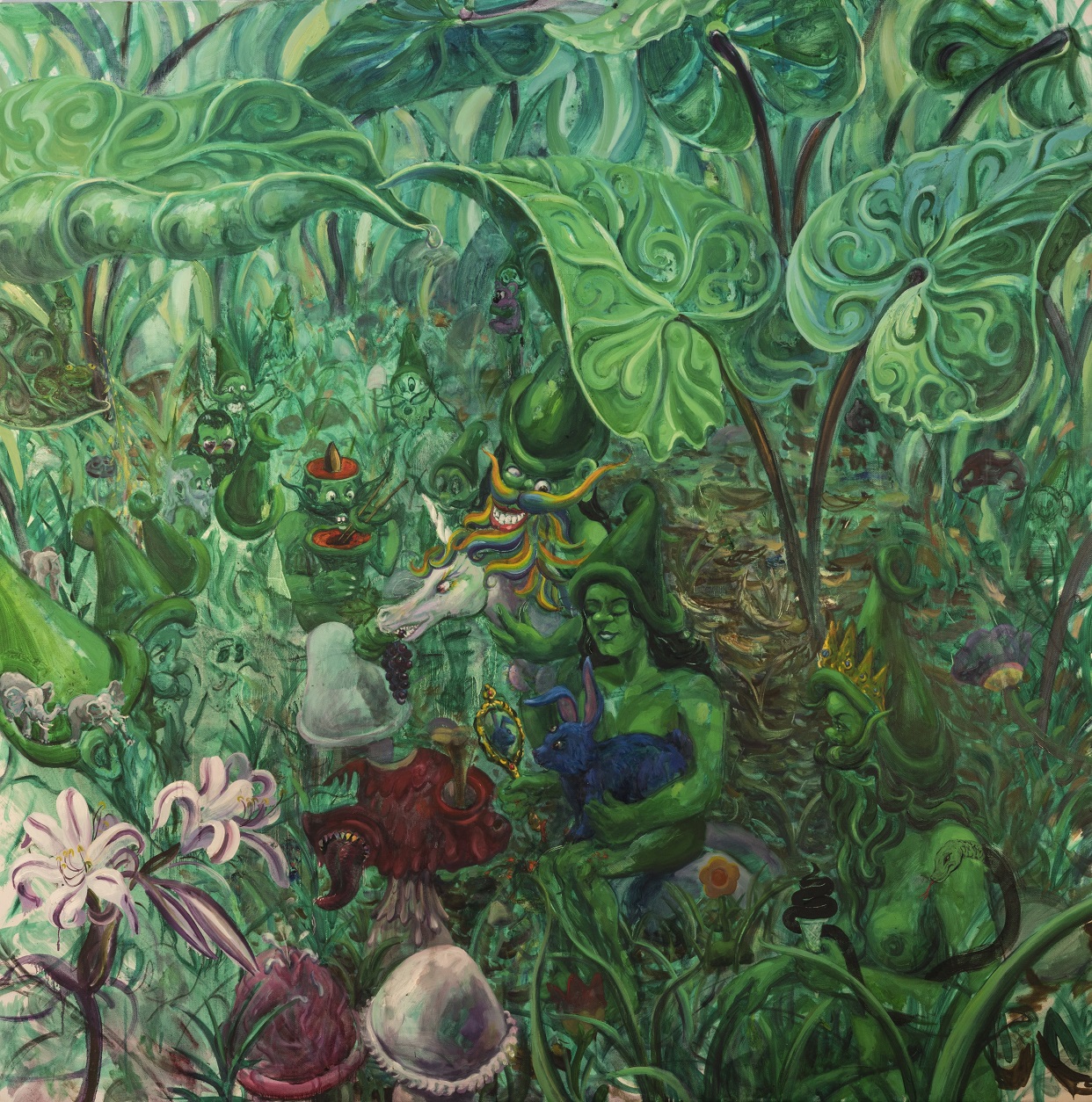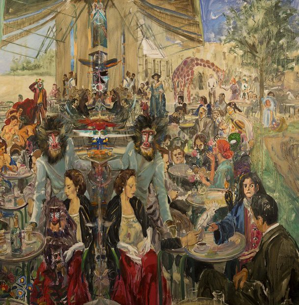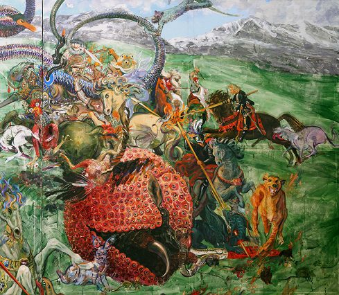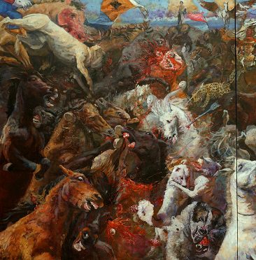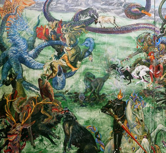 En la obra de Miguel Machado frecuentemente encontramos una tupida figuración en la que, amalgamados, se distinguen animales y personajes mitológicos o monstruosos, cuyo origen podríamos rastrear en textos culturales de la tradición occidental que se entremezclan con la propia imaginación del autor. Hiperboliza el paisaje, y en esta representación demanda un alto nivel de suspicacia por parte del espectador, en la búsqueda de disímiles detalles cargados de figuras y simbolismos que dan forma a sus obras.