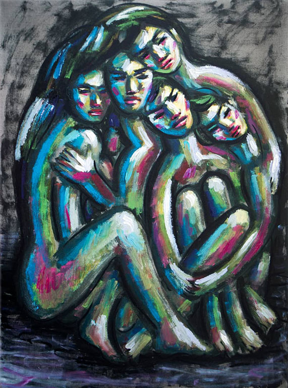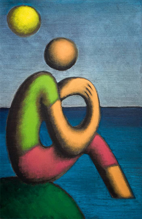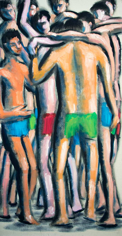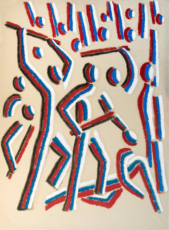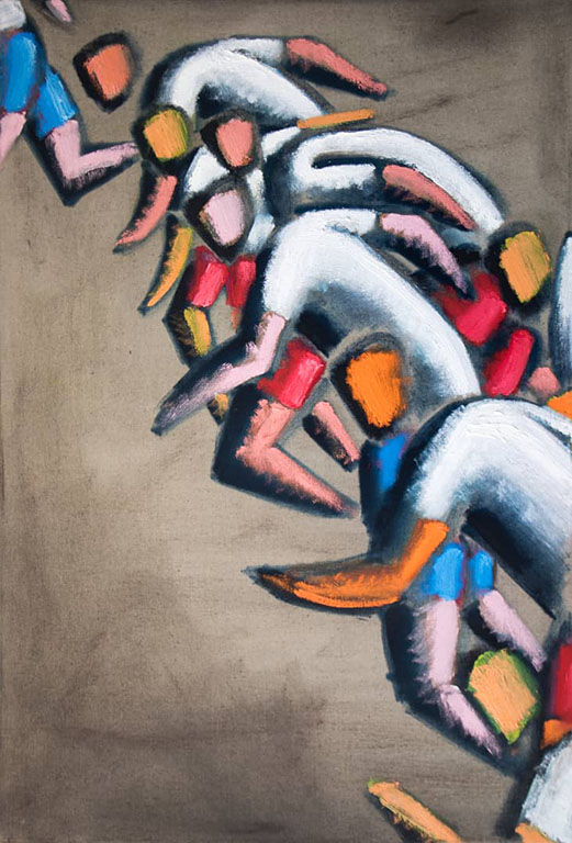 Al realizar un rápido paneo por obras como “La letra del año”, “Out”, “Danza del golfo”, “Arquitectura del poder” y “Summer colors”, se divisa cómo los sujetos representados en ellas se despersonalizan producto de la estilización de sus rasgos, se expanden los encuadres hasta contemplar grupos humanos y/o animales _los cuales tropologizan cuestiones inherentes al individuo_, y se minimizan las formas hasta llegar a soluciones estéticas que coquetean con la abstracción; bien por la reiteración del motivo, que da lugar a composiciones quebradas, o por su tratamiento primitivo, desprovisto de detalles.
