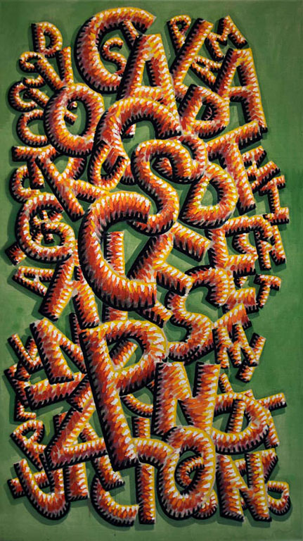 En estos trabajos se perciben reminiscencias de la estética de exponentes modernos de la talla de Tarsila do Amaral y Fernand Léger. Y es que el artista, para proyectarse en su presente, vuelve su mirada a la Historia del Arte o, más específicamente, a la tradición vanguardista de la primera mitad del siglo xx, e incluso; reconecta con elementos discursivos abrazados en los inicios de su trayectoria artística _como el empleo del motivo tipográfico en sus composiciones_.