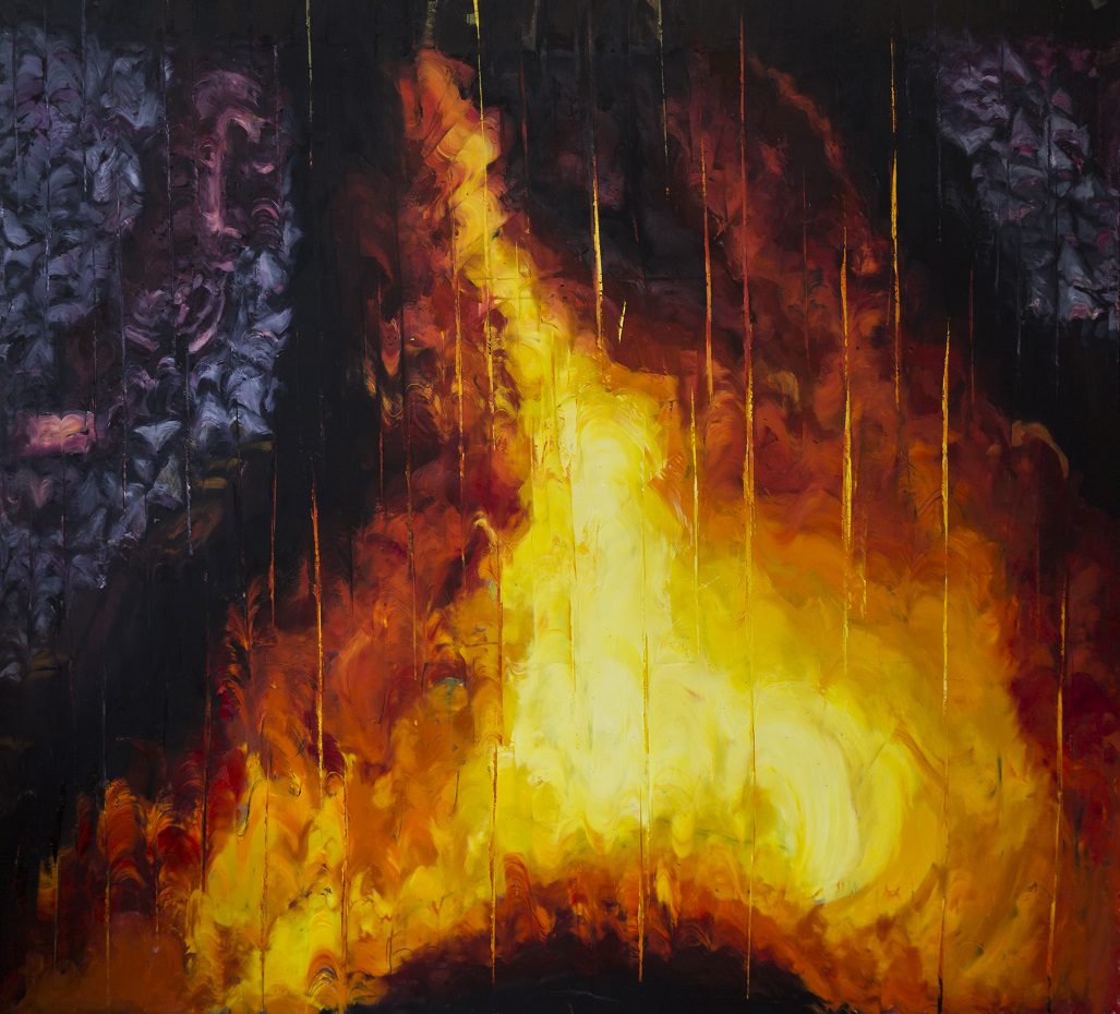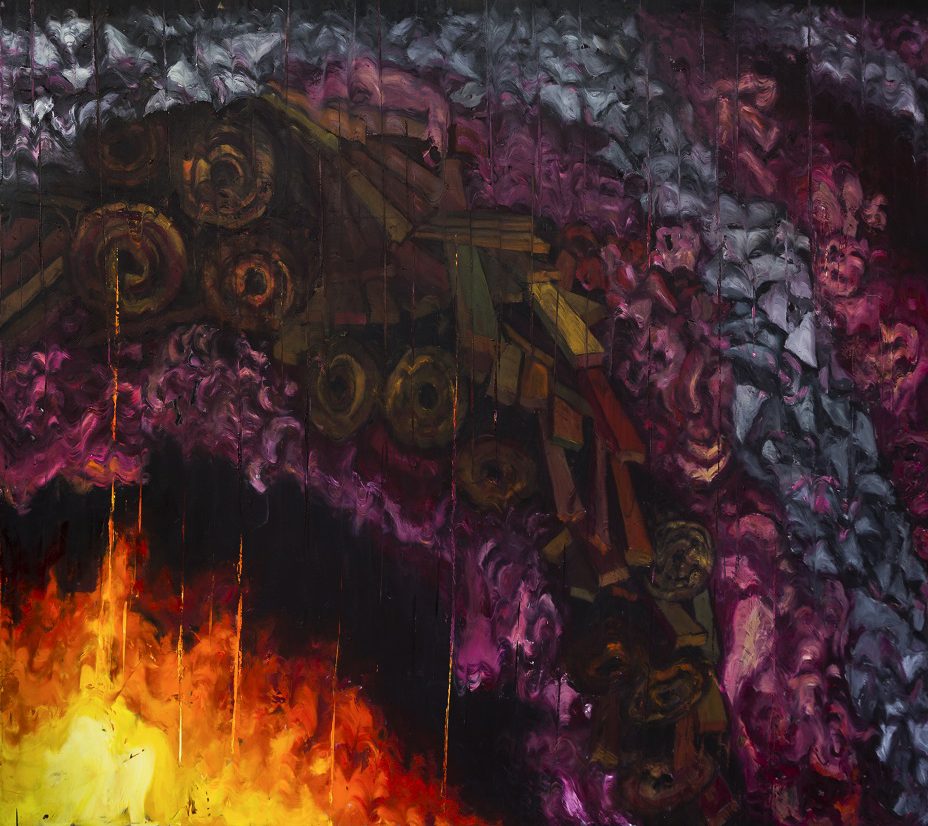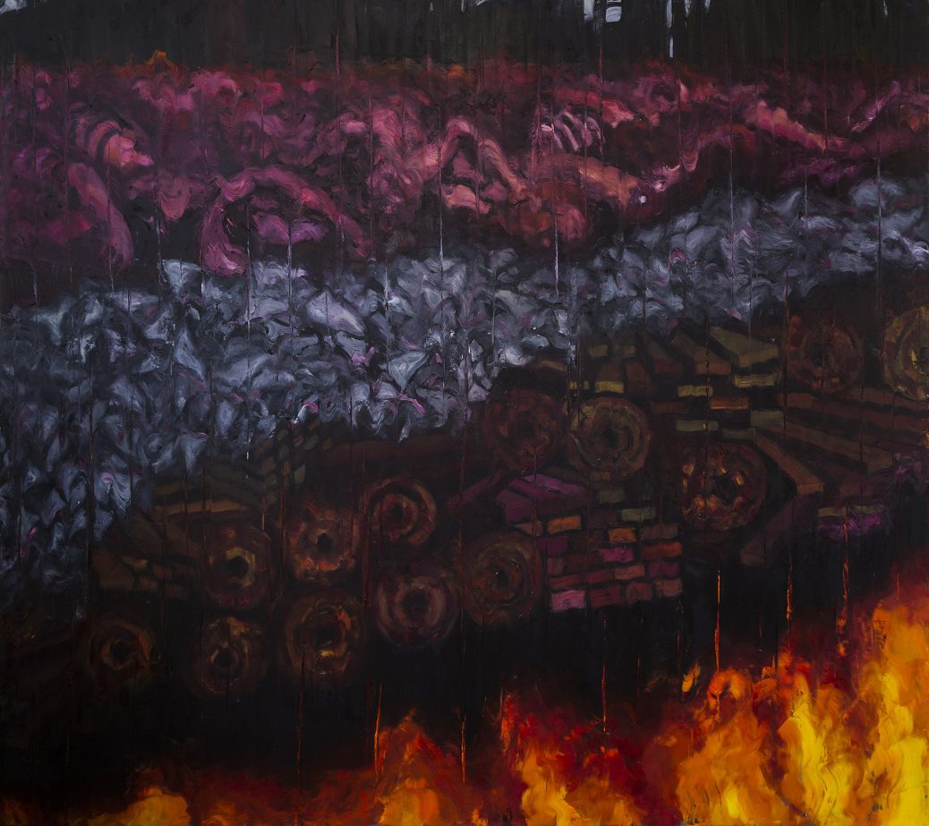 En su obra, José se vale de diversos escenarios simbólicos, provenientes tanto de la naturaleza como de la propia acción del hombre y pone en evidencia la conexión, -a veces antagónica- entre ambos. El árbol y la madera como cuerpo principal, adquieren una fuerte connotación, en este caso vinculados a ese estado de crisis en que se halla el hombre como ser, y al que el artista insiste en apuntar. Esta idea se reafirma desde el diálogo con otro elemento de fuerte carácter simbólico como es el fuego, relación que apunta un tanto a lo caótico, donde todo parece estar encaminado a caer bajo las llamas de un incendio, que, no obstante, aún se muestra incipiente. Los ocho lienzos que conforman la pieza, en su conjunto, muestran una continuidad a modo de capas, donde la individualidad parece haber desaparecido para dar lugar a un conjunto amontonado de cuerpos deshumanizados, troncos de árboles, maquinarias y aletas de tiburón, elemento simbólico recurrente en la obra de Capaz, el cual apunta a la pérdida de la ‘esencia’ como seres humanos.