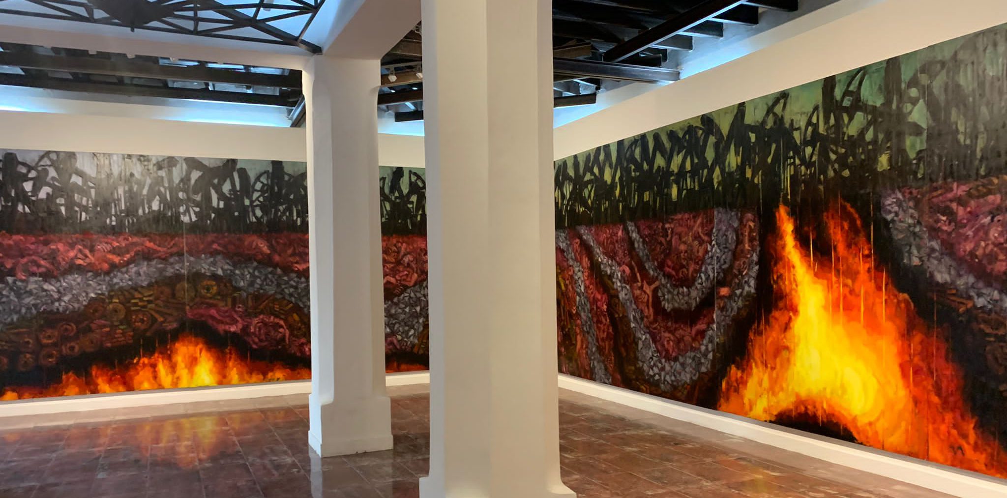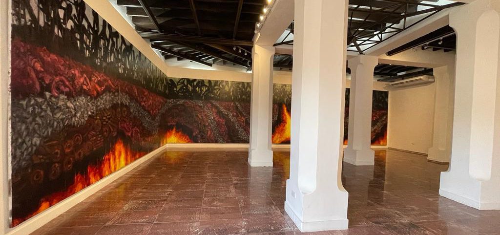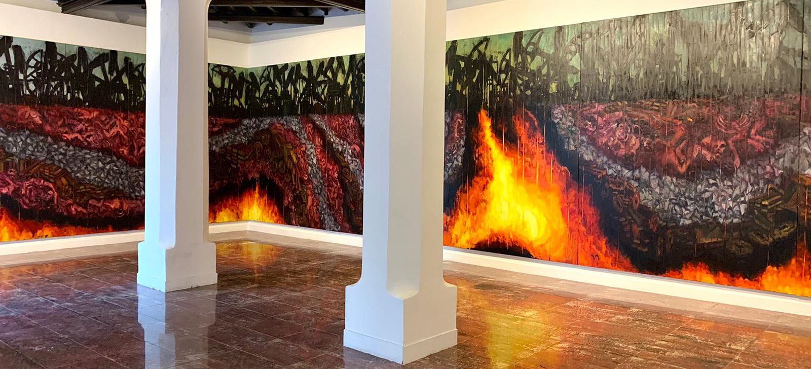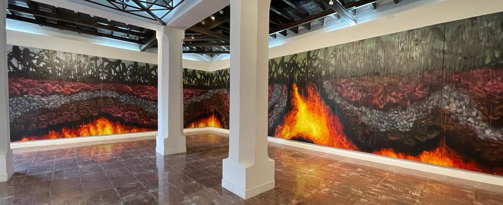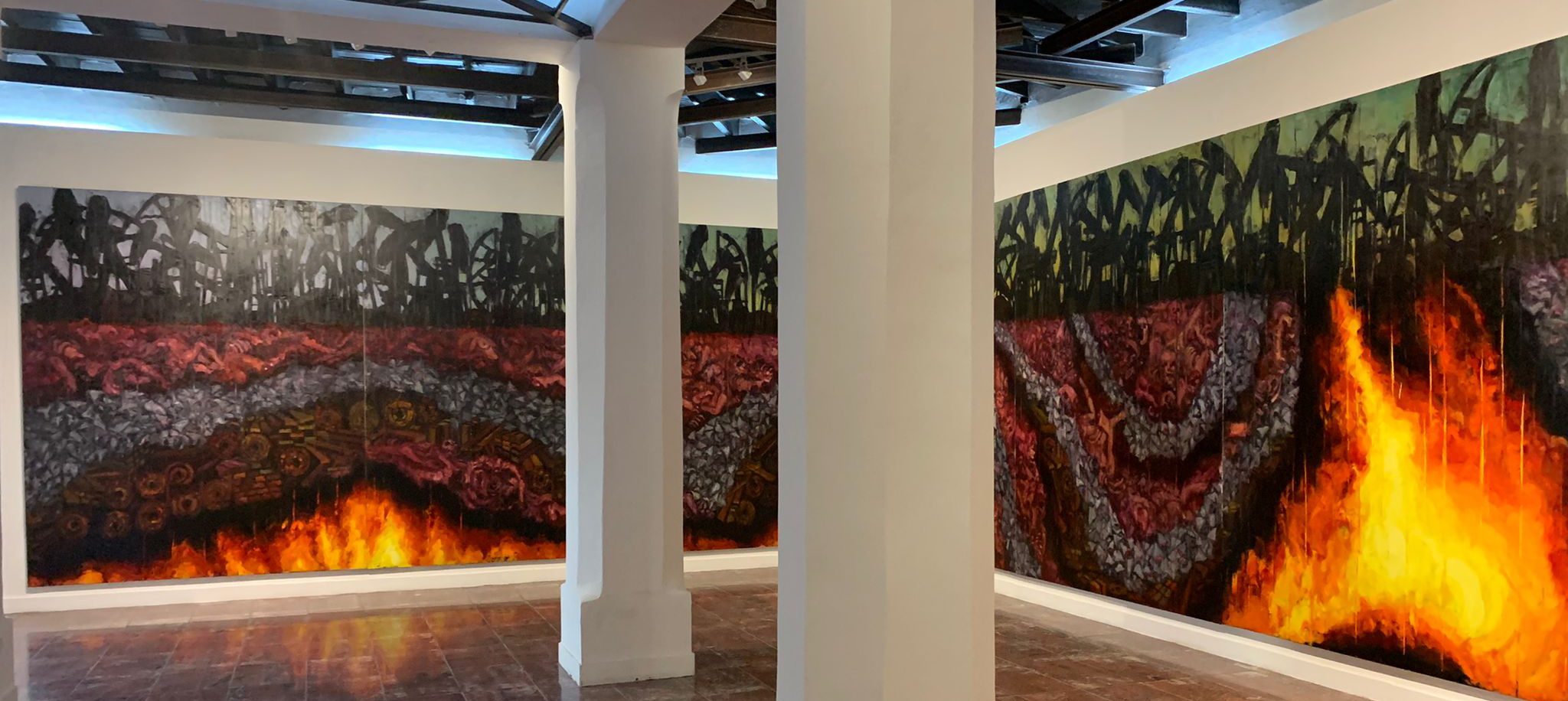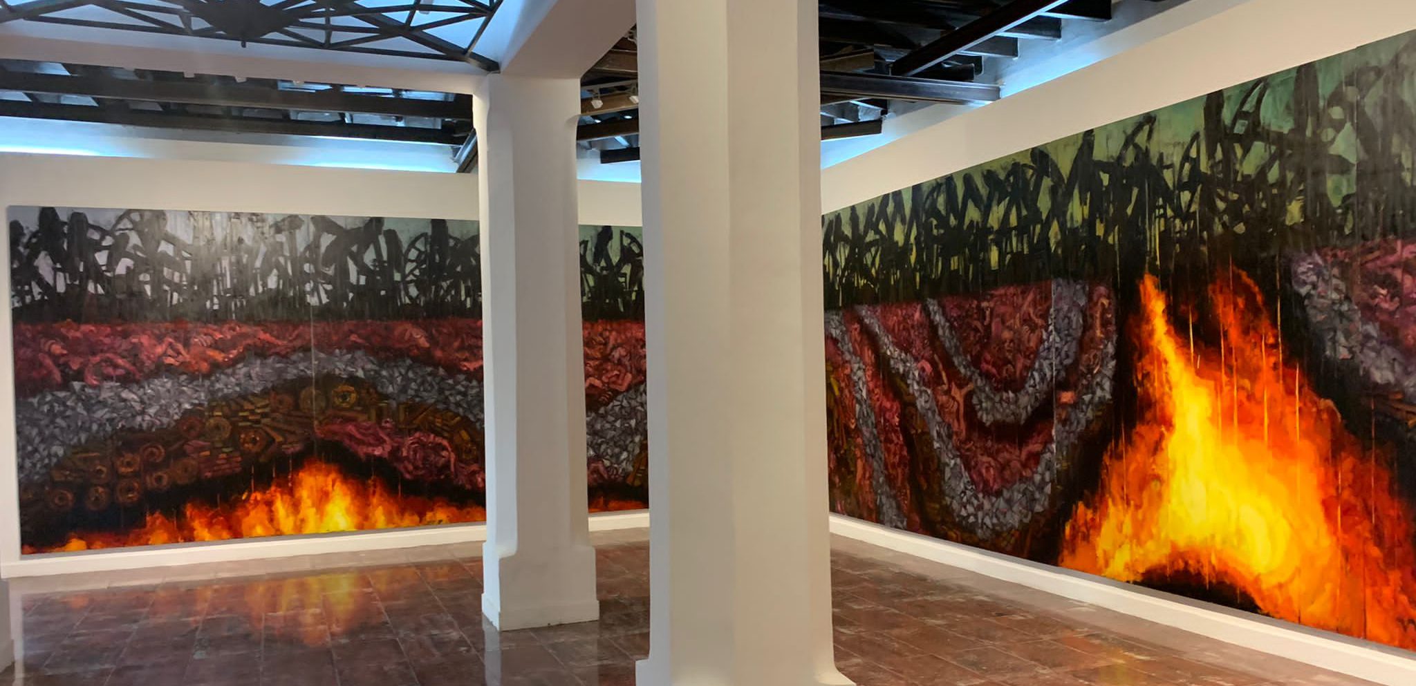 La extracción, pone ante el espectador la más reciente obra del artista, resultado de todo un año de reflexión, indagación y ejercicio pictórico. Conformada por grandes pinturas en la técnica del óleo sobre lienzo, la muestra parece interpelar a todo aquel que entre en las salas de Galería Servando pensando que su relación será meramente contemplativa, pasiva. Ocho lienzos de tres metros de altura y dieciocho metros de ancho en su totalidad cubren de arriba abajo las paredes del espacio. El choque, como estrategia de comunicación es empleado en esta exposición no solo por los grandes formatos de las pinturas que dan forma a esta instalación, sino también por los colores empleados a estas escalas, donde los ocres, rojos y cálidos en general llevan a esta imagen a quedar impregnada en quien la aprecie. Sin dudas, la indiferencia no es una opción.