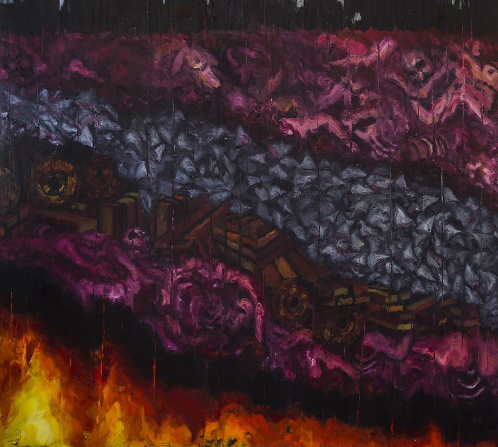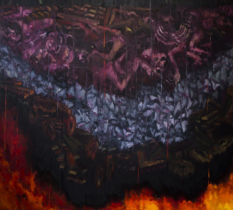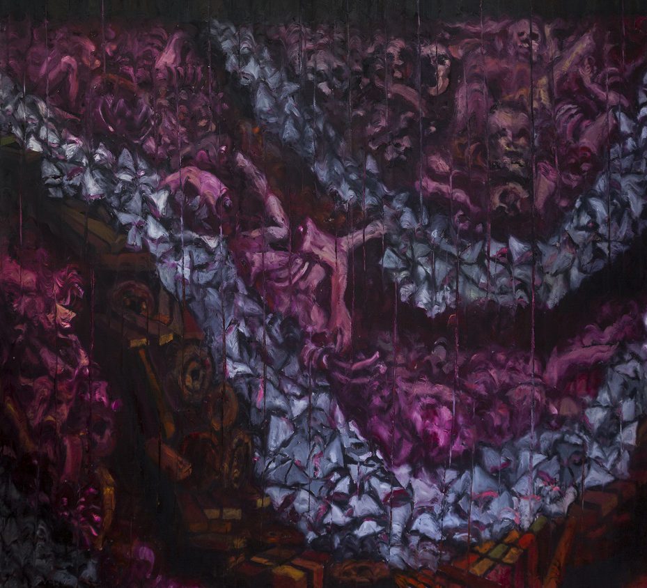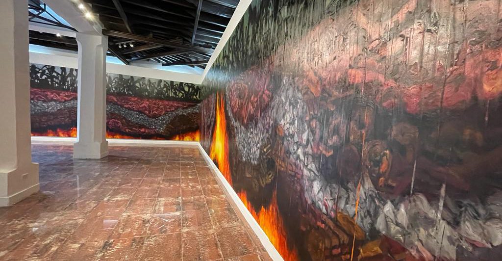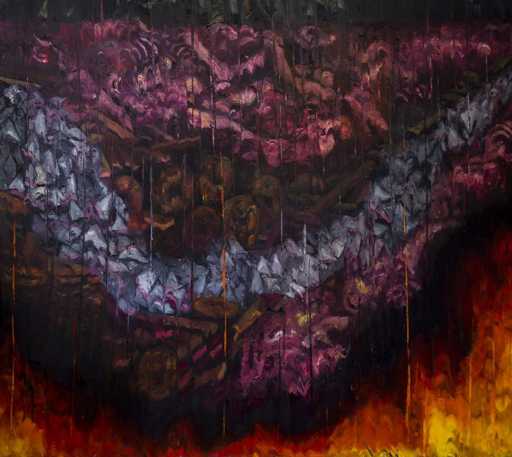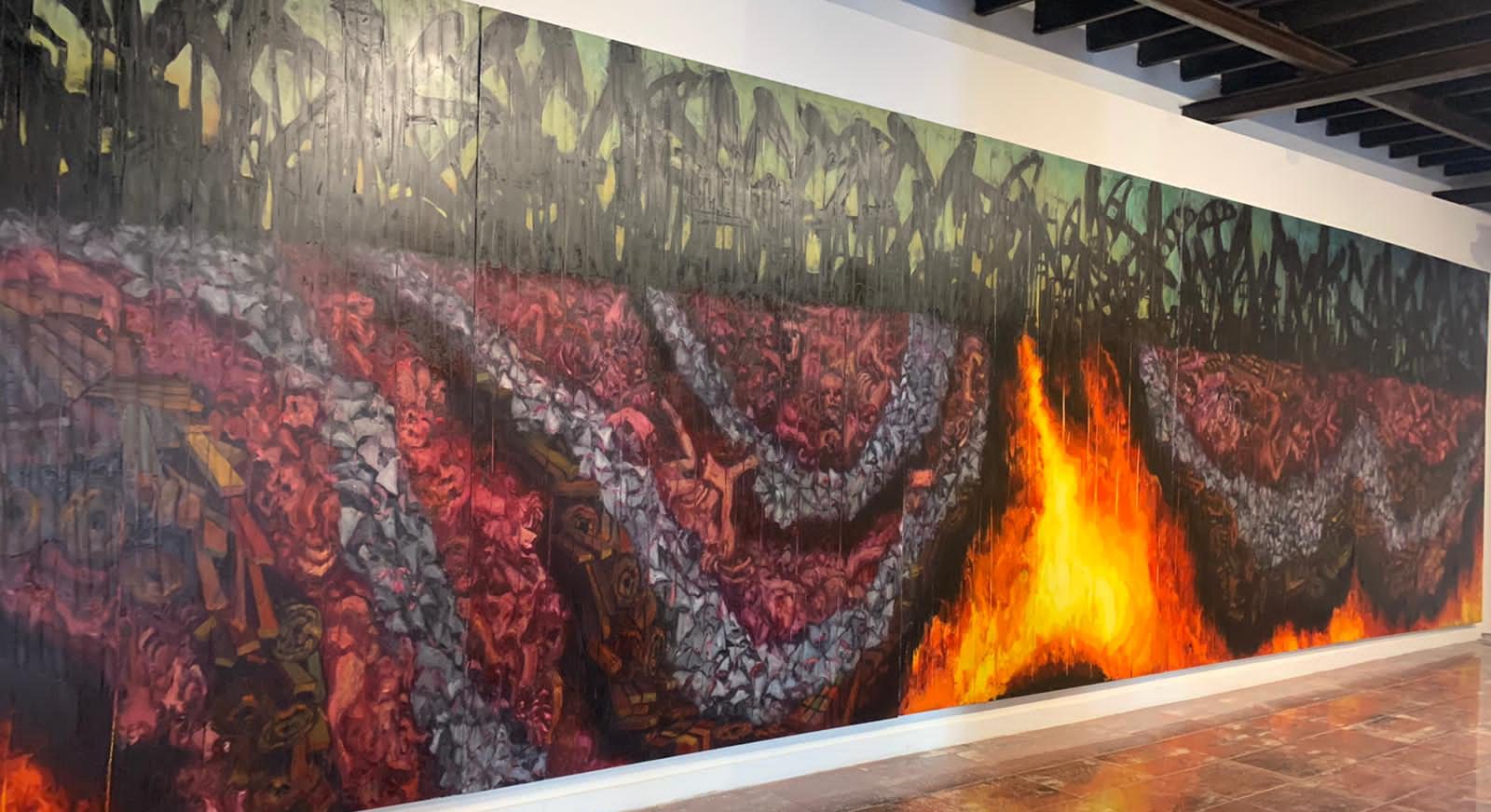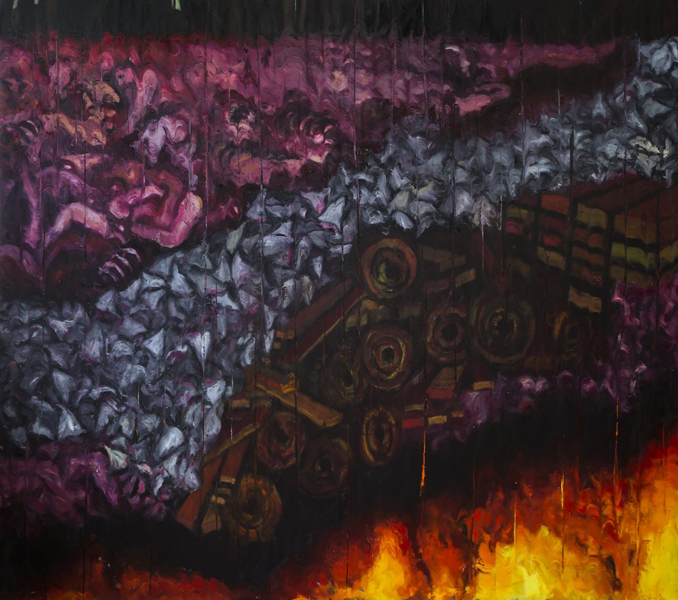 La extracción, pone ante el espectador la más reciente obra del artista, resultado de todo un año de reflexión, indagación y ejercicio pictórico. Conformada por grandes pinturas en la técnica del óleo sobre lienzo, la muestra parece interpelar a todo aquel que entre en las salas de Galería Servando pensando que su relación será meramente contemplativa, pasiva. Ocho lienzos de tres metros de altura y dieciocho metros de ancho en su totalidad cubren de arriba abajo las paredes del espacio. El choque, como estrategia de comunicación es empleado en esta exposición no solo por los grandes formatos de las pinturas que dan forma a esta instalación, sino también por los colores empleados a estas escalas, donde los ocres, rojos y cálidos en general llevan a esta imagen a quedar impregnada en quien la aprecie. Sin dudas, la indiferencia no es una opción.