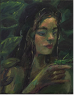 La niña y el grillo. Óleo sobre lienzo, 25 x 15 cm, 2022