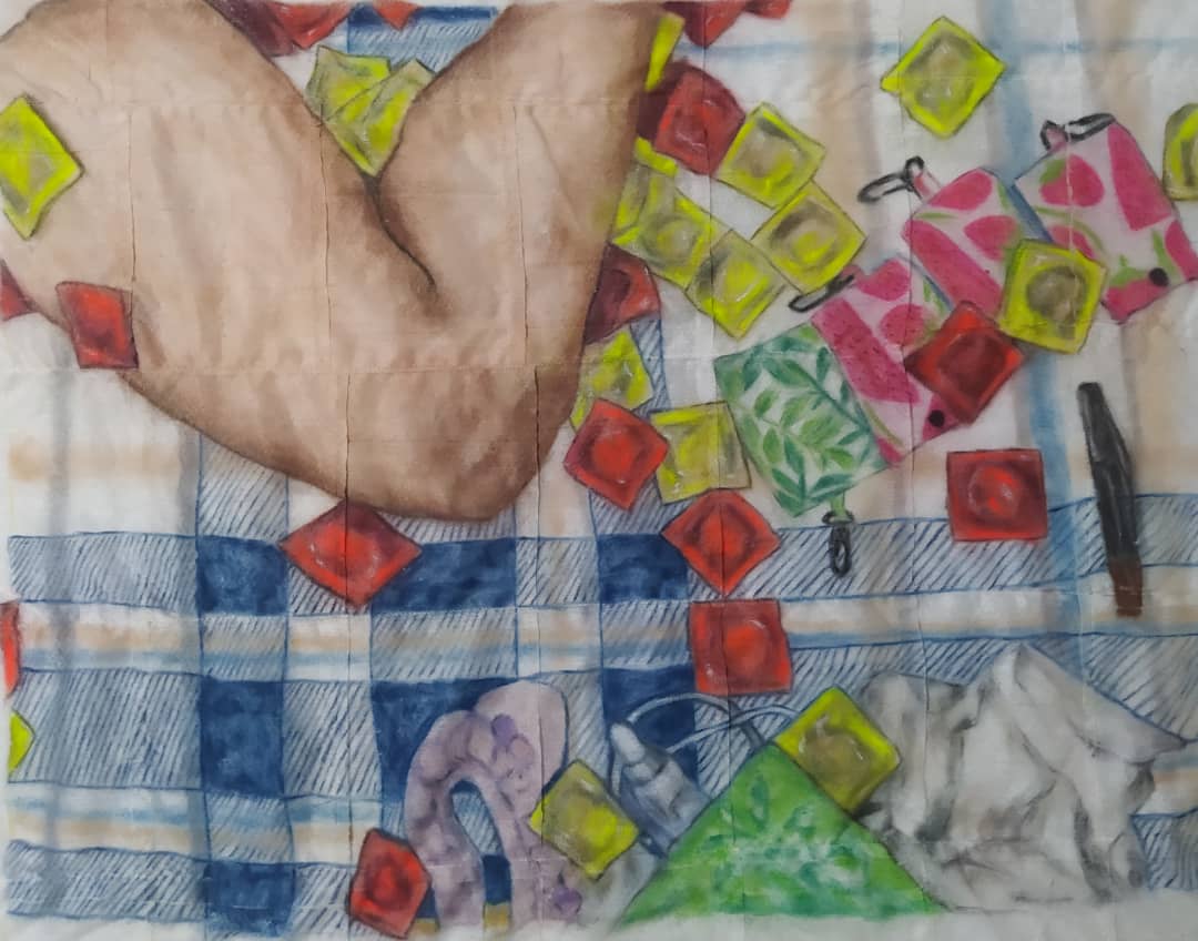 De la serie Los días del amor. Maquillaje/toallas desmaquillantes/lienzo, 60 x 80 cm, 2023