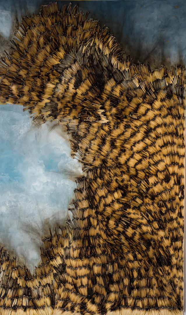 Gruta. Fósforos pegados, quemados y acrílico/lienzo, 100 x 60 cm, 2020