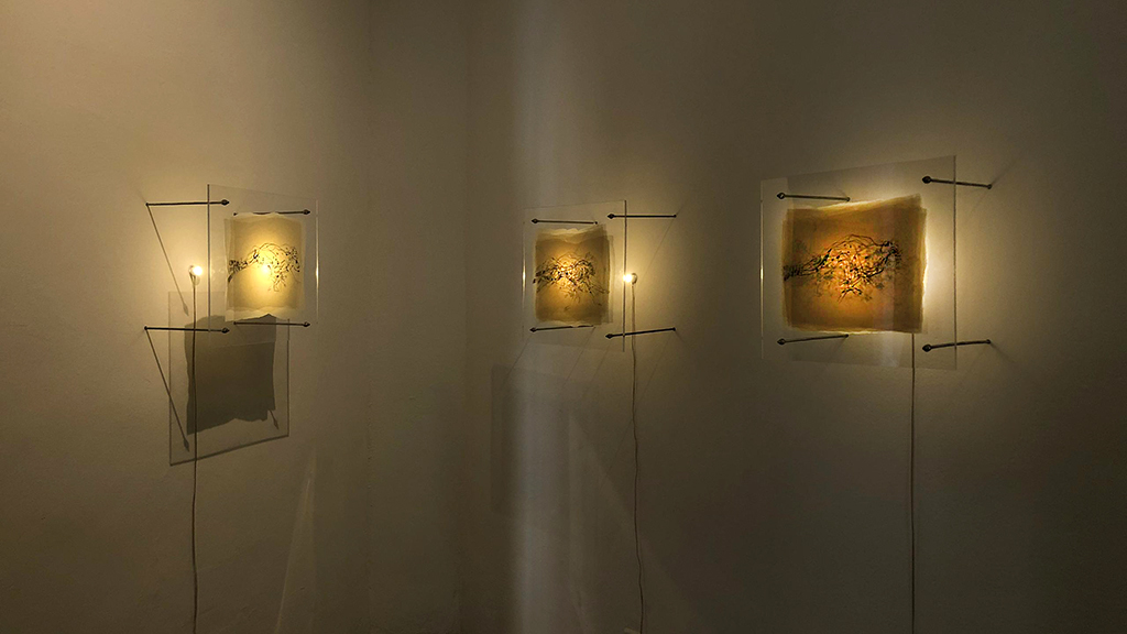 De la serie en proceso Galope. Dibujos instalativos. Dibujo a grafito/papel cebolla, acrílico, luz, varilla de acero 40 x 52 cm (3 piezas), 2020